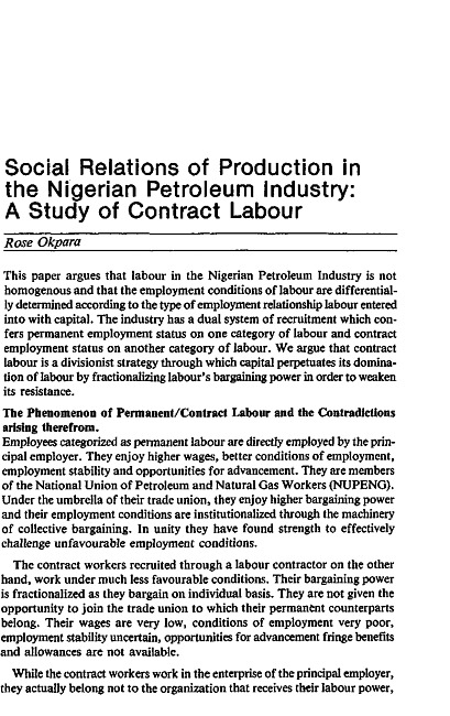 This paper argues that labour in the Nigerian Petroleum Industry is not homogenous and that the employment conditions of labour are differentially determined according to the type of employment relationship labour entered into with capital. The industry has a dual system of recruitment which confers permanent employment status on one category of labour and contract employment status on another category of labour. We argue that contract labour is a divisionist strategy through which capital perpetuates its domination of labour by fractionalizing labour's bargaining power in order to weaken its resistance.