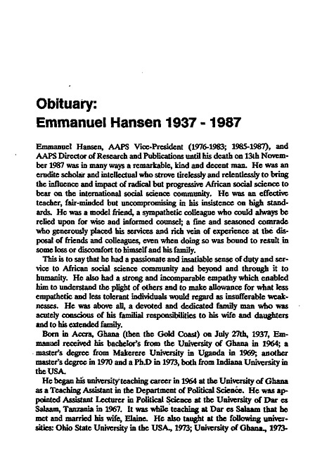 Obituary : Emmanuel Hansen 1937-1987
