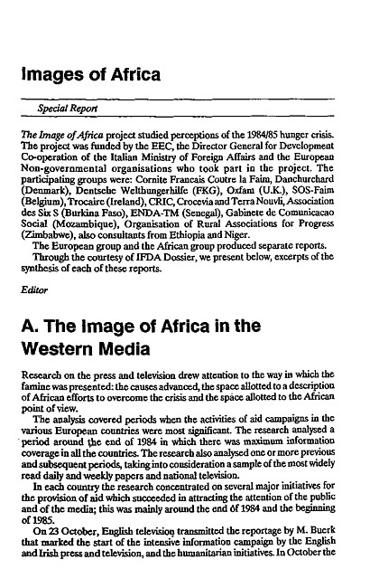 The Image of Africa project studied perceptions of the 1984/85 hunger crisis.The project was funded by the EEC, the Director General for Development Co-operation of the Italian Ministry of Foreign Affairs and the European Non-governmental organisations who took part in the project. The participating groups were: Cornite Francais Coutre la Faim, Danchurchard (Denmark), Dentsehe Welthungerhilfe (FKG), Oxfam (U.K.), SOS-Faim (Belgium), Trocaire (Ireland), CRIC, Crocevia and Terra Nouvli, Associationdes Six S (Burkina Faso), ENDA-TM (Senegal), Gabinete de ComunicacaoSocial (Mozambique), Organisation of Rural Associations for Progress (Zimbabwe), also consultants from Ethiopia and Niger. The European group and the African group produced separate reports. Through the courtesy of IFDA Dossier, we present below, excerpts of the synthesis of each of these reports.