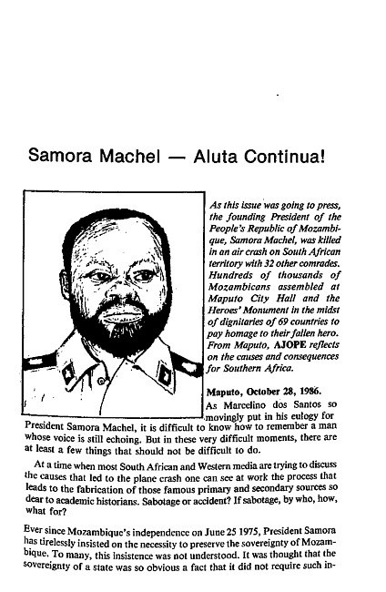 As this issue was going to press, the founding President of the People's Republic of Mozambique, Samora Machel, was killedin an air crash on South African territory with 32 other comrades. Hundreds of thousands ofMozambicans assembled at Maputo City Hall and the Heroes' Monument in the midst of dignitaries of 69 countries to pay homage to their fallen hero. From Maputo, AJOPE reflects on the causes and consequences for Southern Africa.