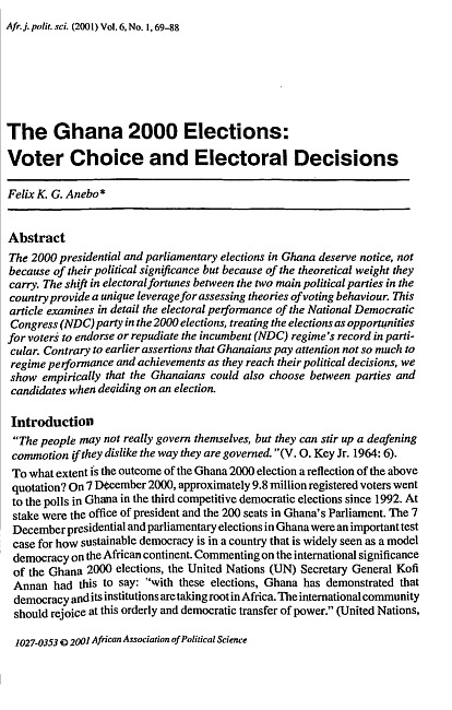 The 2000 presidential and parliamentary elections in Ghana deserve notice, not because of their political significance but because of the theoretical weight they carry. The shift in electoral fortunes between the two main political parties in the country provide a unique leverage for assessing theories of voting behaviour. This article examines in detail the electoral performance of the National Democratic Congress (NDC) party in the 2000 elections, treating the elections as opportunities for voters to endorse or repudiate the incumbent (NDC) regime's record in particular. Contrary to earlier assertions that Ghanaians pay attention not so much to regime performance and achievements as they reach their political decisions, we show empirically that the Ghanaians could also choose between parties and candidates when deciding on an election.