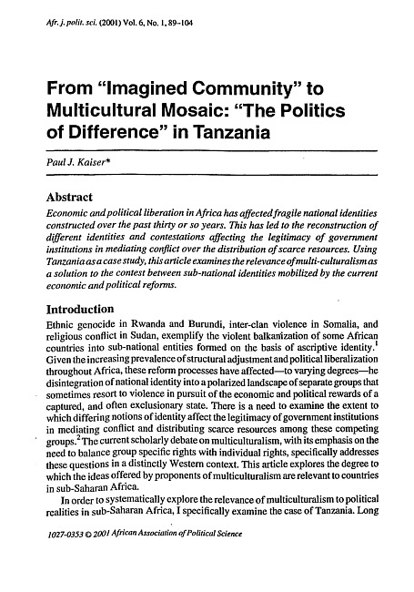 From "imagined community" to multicultural mosaic : "the politics of difference" in Tanzania