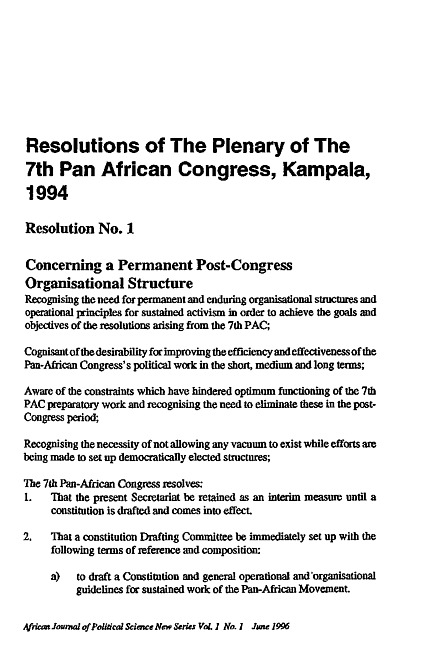 Resolutions of the plenary of the 7th Pan African Congress, Kampala, 1994
