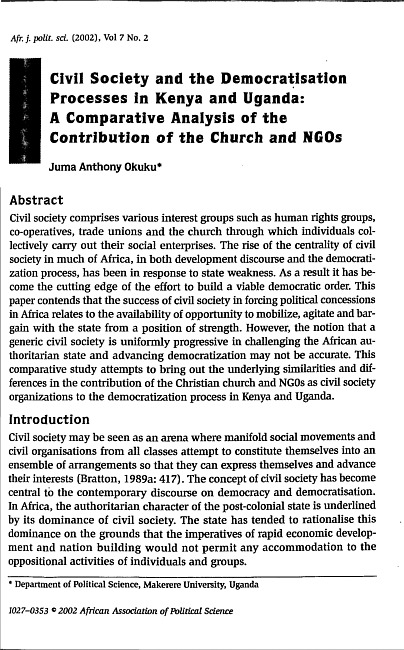 Civil society comprises various interest groups such as human rights groups, co-operatives, trade unions and the church through which individuals collectively carry out their social enterprises. The rise of the centrality of civil society in much of Africa, in both development discourse and the democratization process, has been in response to state weakness. As a result it has become the cutting edge of the effort to build a viable democratic order. This paper contends that the success of civil society in forcing political concessions in Africa relates to the availability of opportunity to mobilize, agitate and bargain with the state from a position of strength. However, the notion that ageneric civil society is uniformly progressive in challenging the African authoritarian state and advancing democratization may not be accurate. This comparative study attempts to bring out the underlying similarities and differences in the contribution of the Christian church and NGOs as civil society organizations to the democratization process in Kenya and Uganda.