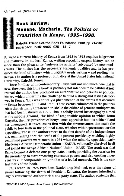 Book review : The politics of transition in Kenya, 1995-1998. By Macharia Munene. Nairobi: Friends-of-the Book Foundation, 2001