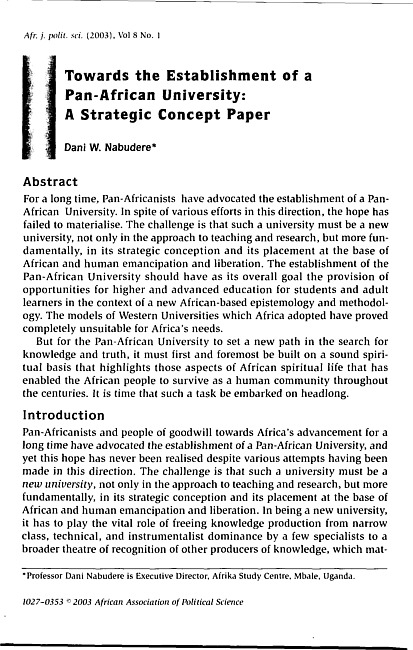 For a long time, Pan-Africanists have advocated the establishment of a Pan-African University. In spite of various efforts in this direction, the hope has failed to materialise. The challenge is that such a university must be a new university, not only in the approach to teaching and research, but more fundamentally, in its strategic conception and its placement at the base of African and human emancipation and liberation. The establishment of the Pan-African University should have as its overall goal the provision of opportunities for higher and advanced education for students and adult learners in the context of a new African-based epistemology and methodology. The models of Western Universities which Africa adopted have proved completely unsuitable for Africa's needs. But for the Pan-African University to set a new path in the search for knowledge and truth, it must first and foremost be built on a sound spiritual basis that highlights those aspects of African spiritual life that has enabled the African people to survive as a human community throughout the centuries. It is time that such a task be embarked on headlong.