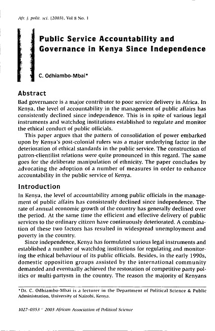 Bad governance is a major contributor to poor service delivery in Africa. In Kenya, the level of accountability in the management of public affairs has consistently declined since independence. This is in spite of various legal instruments and watchdog institutions established to regulate and monitor the ethical conduct of public officials. This paper argues that the pattern of consolidation of power embarked upon by Kenya's post-colonial rulers was a major underlying factor in the deterioration of ethical standards in the public service. The construction of patron-clientilist relations were quite pronounced in this regard. The same goes for the deliberate manipulation of ethnicity. The paper concludes by advocating the adoption of a number of measures in order to enhance accountability in the public service of Kenya.