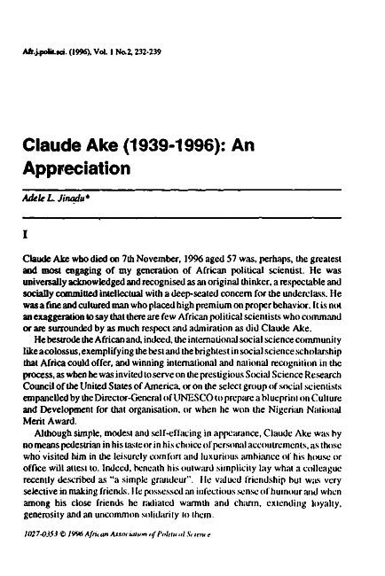 Claude Ake (1939-1996) : an appreciation
