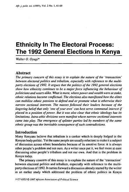 The primary concern of this essay is to explain the nature of the 'transaction' between electoral politics and tribalism, especially with reference to the multiparty elections of 1992. It argues that the politics of the 1992 general elections show how ethnicity continues to be a major force influencing the behaviour of politicians and voters alike. What is more, where power and wealth were at stake, ethnic relations became conflictual. The elections also manifested how the elites can mobilise ethnic passions to defend and or promote what is otherwise their narrow sectional interests. The masses followed their leaders because of the lingering belief that only "one of your own" can best serve communal interest if placed in a position of power. But it was also clear that ethnic ideology has its limitations. Intra-ethnic divisions were manifest where narrow sectional interests came into play. The emergence of splinter parties led by members of the same ethnic group was the inevitable consequence of such contradictions.