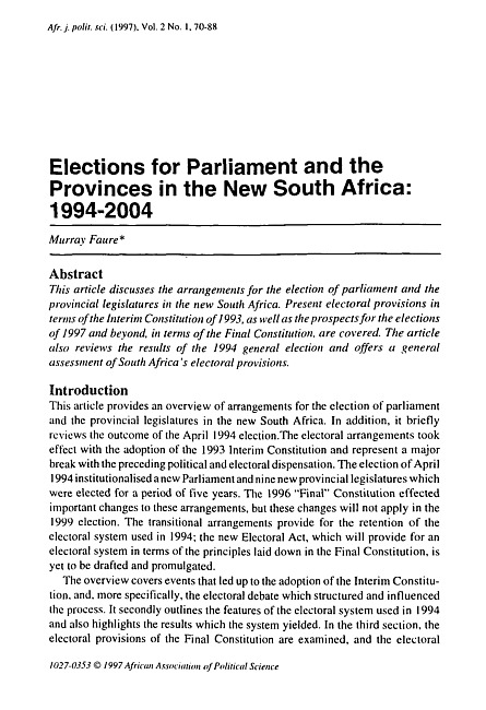 This article discusses the arrangements for the election of parliament and the provincial legislatures in the new South Africa. Present electoral provisions in terms of the Interim Constitution of 1993, as well as the prospects for the elections of 1997 and beyond, in terms of the Final Constitution, are covered. The article also reviews the results of the 1994 general election and offers a general assessment of South Africa's electoral provisions.