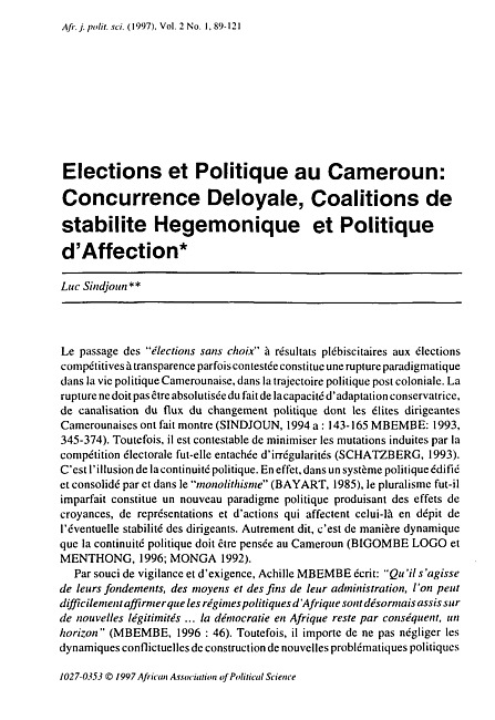 Elections et politique au Cameroun : concurrence déloyale, coalitions de stabilité hégmonique et politique d'Affection