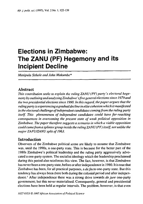 This contribution seeks to explain the ruling ZANU (PF) party's electoral hegemony by outlining and analysing Zimbabwe's five general elections since 1979 and the two presidential elections since 1990. In this regard, the paper argues that the ruling party is experiencing a gradual decline in elite cohesion which is manifested in the electoral challenge of independent candidates coming from the ruling party itself. This phenomenon of independent candidates could have far-reaching consequences in overcoming the present state of weak political opposition in Zimbabwe. The paper therefore suggests a scenario in which a viable opposition could come from a splinter group inside the ruling ZANU (PF) itself not unlike the major ZAPU/ZANU split of 1963.