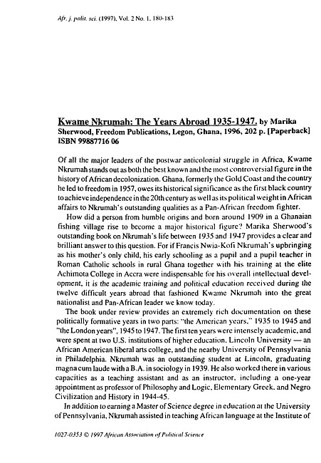 Book review : Kwame Nkrumah. By Marika Sherwood. Legon, Ghana: Freedom Publications, 1996