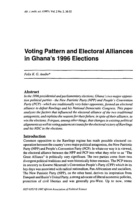 In the 1996 presidential and parliamentary elections, Ghana's two major opposition political parties - the New Patriotic Party (NPP) and People's Convention Party (PCP) - which are traditionally very bitter opponents, formed an electoral alliance to defeat Rowlings and his National Democratic Congress. This paper analyses the factors that influenced the electoral alliance of the two traditional antagonists, and explains the reasons for their failure, in spite of their alliance, to win the elections. It argues, among other things, that changes in existing political alignments as well as voting patterns accounts for the electoral victory of Rowlings and his NDC in the elections.