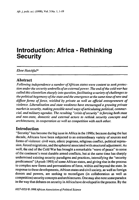 Following independence a number of African states were content to seek protection under the security umbrella of an external power. The end of the cold war has called this clientelism sharply into question, facilitating a variety of challenges to the political hegemony of the state and the emergence at the same time of new and diffuse forms of force, wielded by private as well as official entrepreneurs of violence. Liberalisation and state weakness have encouraged a growing private market in security, making possible novel ways of articulating political, commercial, and military agendas. The resulting "crisis of security" is forcing both state and non-state, domestic and external actors to rethink security concepts and architectures, in cooperation as well as competition with each other.