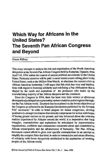 This essay attempts to analyse the role and organisation of the North American delegation at the Seventh Pan African Congress held in Kampala, Uganda, from April 3-8, 1994 within the context of current political movements in the United States. Particular attention will be paid to more recent events taking place in the United States, such as the Million Man March, to elucidate the current crisis in African-American leadership. I will argue that this crisis has very real implications with regard to fostering solidarity and redefining a Pan Africanism that is shaped by the needs and aspirations of the producers who make up the overwhelming majority of the African diaspora and the continent.
