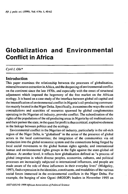 This paper examines the relationship between the processes of globalisation, mineral/resource extraction in Africa, and the deepening of environmental conflicton the continent since the late 1970s, and especially with the onset of structural adjustment which imposed the hegemony of the free market on the African ecology.