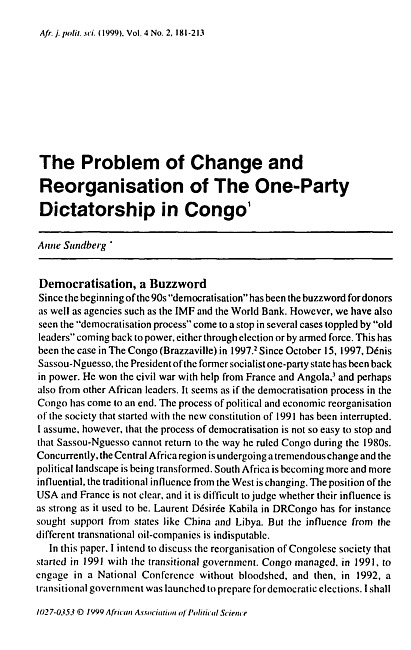 The problem of change and reorganisation of the one-party dictatorship in Congo