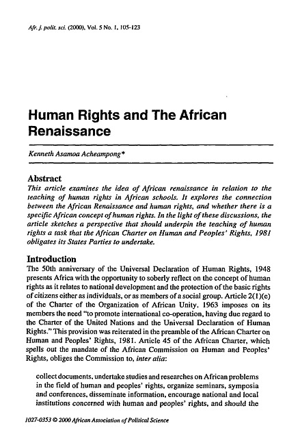 This article examines the idea of African renaissance in relation to the teaching of human rights in African schools. It explores the connection between the African Renaissance and human rights, and whether there is a specific African concept of human rights. In the light of these discussions, the article sketches a perspective that should underpin the teaching of human rights a task that the African Charter on Human and Peoples' Rights, 1981 obligates its States Parties to undertake.