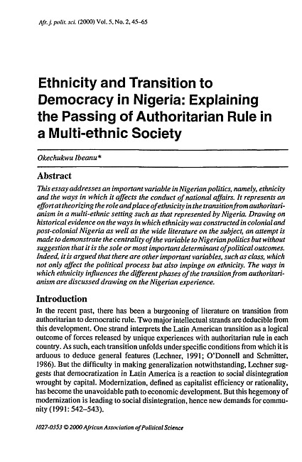 This essay addresses an important variable in Nigerian politics, namely, ethnicity and the ways in which it affects the conduct of national affairs. It represents an effort at theorizing the role and place of ethnicity in the transition from authoritarianism in a multi-ethnic setting such as that represented by Nigeria. Drawing on historical evidence on the ways in which ethnicity was constructed in colonial and post-colonial Nigeria as well as the wide literature on the subject, an attempt is made to demonstrate the centrality of the variable to Nigerian politics but without suggestion that it is the sole or most important determinant of political outcomes. Indeed, it is argued that there are other important variables, such as class, which not only affect the political process but also impinge on ethnicity. The ways in which ethnicity influences the different phases of the transition from authoritarianism are discussed drawing on the Nigerian experience.