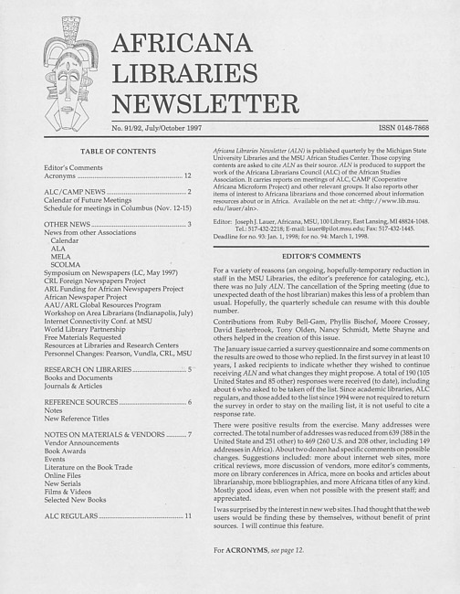 Africana libraries newsletter. No. 91/92 (1997 July/October)