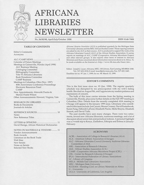 Africana libraries newsletter. No. 94/95/96 (1998 April/July/October)