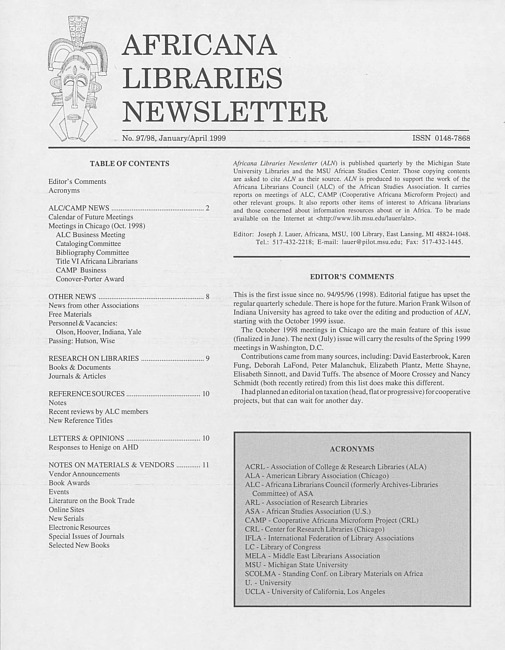 Africana libraries newsletter. No. 97/98 (1999 January/April)