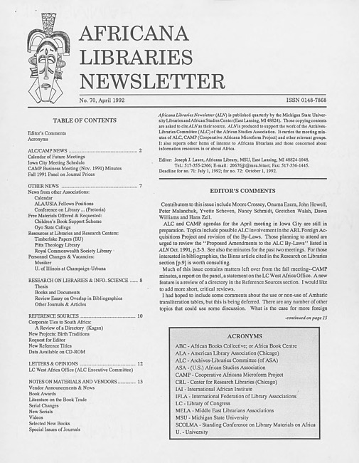 Africana libraries newsletter. No. 70 (1992 April)