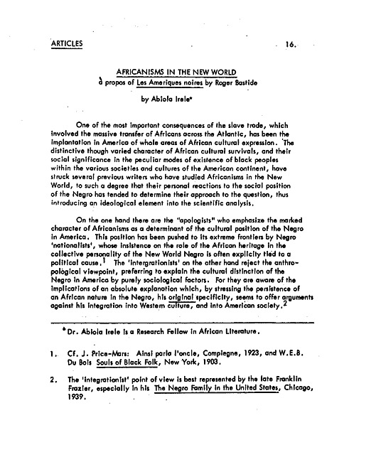 Africanisms in the new world : à propos of Les Ameriques noires by Roger Bastide