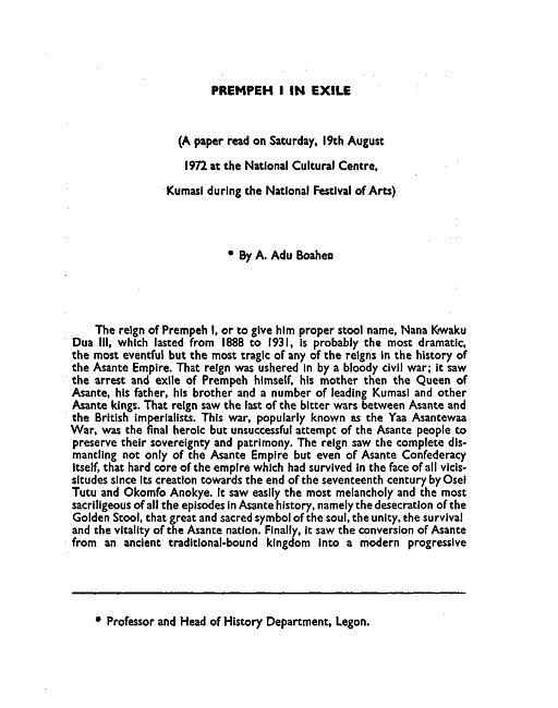 Prempeh I in exile (a paper read on Saturday, 19th August 1972 at the National Cultural Centre, Kumasi during the National Festival of Arts)