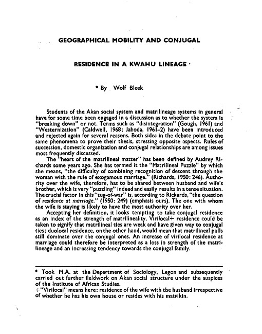 Geographical mobility and conjugal : residence in a Kwahu lineage