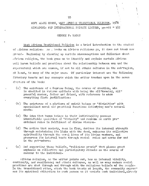 Review of: Kofi Asare Opoku. West African traditional religion. Accra: FEP International Private Limited, 1978