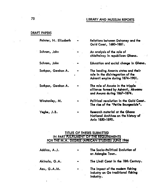 Titles of theses submitted in part fulfilment of the requirements for the M.A. degree (African studies) June 1966