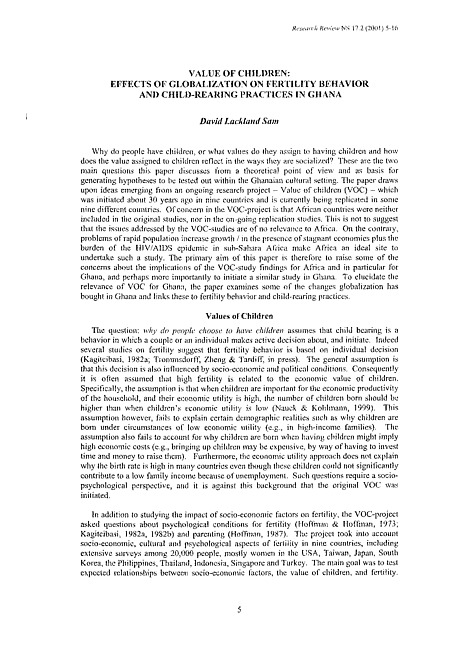 Why do people have children, or what values do they assign to having children and how does the value assigned to children reflect in the ways they are socialized? These are the two main questions this paper discusses from a theoretical point of view and as basis for generating hypotheses to be tested out within the Ghanaian cultural setting. The paper draws upon ideas emerging from an ongoing research project - Value of children (VOC) - which was initiated about 30 years ago in nine countries and is currently being replicated in some nine different countries. Of concern in the VOC-project is that African countries were neither included in the original studies, nor in the on-going replication studies. This is not to suggest that the issues addressed by the VOC-studies are of no relevance to Africa. On the contrary, problems of rapid population increase growth / in the presence of stagnant economies plus the burden of the HIV/AIDS epidemic in sub-Sahara Africa make Africa an ideal site to undertake such a study. 'The primary aim of this paper is therefore to raise some of the concerns about the implications of the VOC-study findings for Africa and in particular for Ghana, and perhaps more importantly to initiate a similar study in Ghana. To elucidate the relevance of VOC for Ghana, the paper examines some of the changes globalization has bought in Ghana and links these to fertility behavior and child-rearing practices.