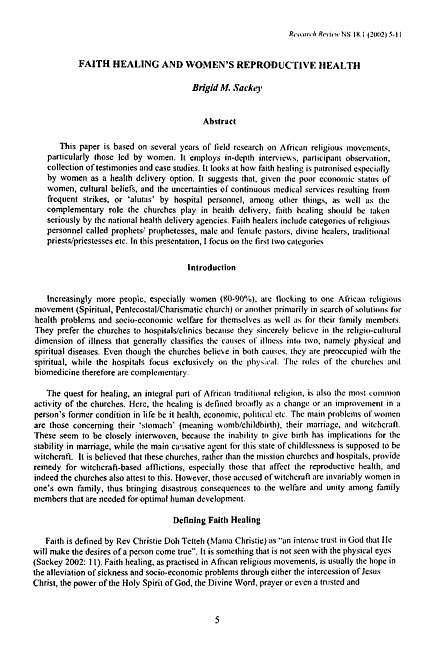 This paper is based on several years of field research on African religious movements, particularly those led by women. It employes in-depth interviews, participant observation, collection of testimonies and case studies. It looks at how faith healing is patronised especially by women as a health delivery option. It suggests that, given the poor economic status of women, cultural beliefs, and the uncertainties of continuous medical services resulting from frequent strikes, or "alutas" by hospital personnel, among other things, as well as the complementary role of churches play in health delivery, faith healing should be taken seriously by the national health delivery agencies. Faith healers include categories of religious personnel called prophets/ prophetesses, mail and female pastors, divine healers, traditional priests/priestesses etc. In this presentation, I focus on the first two categories.