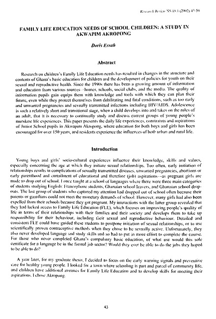 Research on children's Family Life Education needs has resulted in changes in the structure and contents of Ghana's basic education for children and the development of policies for youth on their sexual and reproductive health. Since the 1990s there has been a growing amount of information and education from various sources - homes, schools, social clubs, and the media. The quality of information pupils gain equips them with knowledge and tools with which they can plan their future, even while they protect themselves from debilitating and fatal conditions, such as too early and unwanted pregnancies and sexually transmitted infections including HIV/AIDS. Adolescence is such a relatively short and transitional stage, when a child develops into and takes on the roles of an adult, that it is necessary to continually study and discuss current groups of young people’s mundane life experiences. This paper presents the daily life experiences, constraints and aspirations of junior school pupils in Akwapim Akropong, where education for both boys and girls has been encouraged for over 150 years, and residents experience the influences of both urban and rural life.