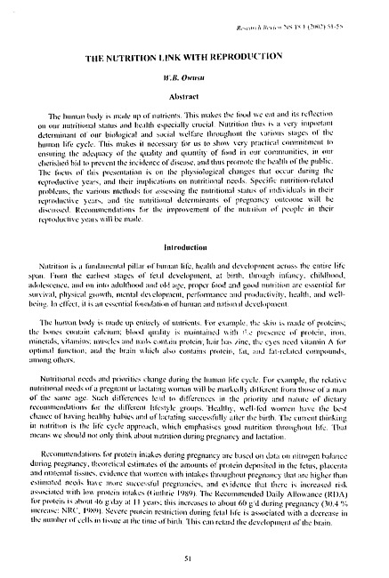 The human body is made up of nutrients. This makes the food we eat and its reflection on our nutritional status and health especially crucial. Nutrition thus is a very important determinant of our biological and social welfare throughout the various stages of the human life cycle. This makes it necessary for us to show very practical commitment to ensuring the adequacy of the quality and quantity of food in our communities, in our cherished bid to prevent the incidence of disease, and thus promote the health of the public. The focus of this presentation is on the physiological changes that occur during the reproductive years, and their implications on nutritional needs. Specific nutrition-related problems, the various methods for assessing the nutritional status of individuals in their reproductive years, and the nutritional determinants of pregnancy outcome will be discussed. Recommendations for the improvement of the nutrition of people in their reproductive years will be made.