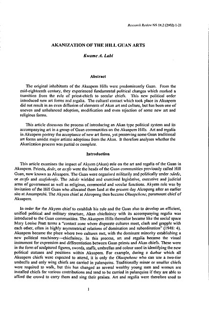 The original inhabitants of the Akuapern Hills were predominantly Guan. From the mid-eighteenth century, they experienced fundamental political changes which marked a transition from the rule of priest-chiefs to secular chiefs. This new political order introduced new art forms and regalia. The cultural contact which took place in Akuapem did not result in an even diffusion of elements of Akan art and culture, but has been one of uneven and unbalanced adoption, modification and even rejection of some new art and religious forms. This article discusses the process of introducing an Akan type political system and its accompanying art in a group of Guan communities on the Akuapem Hills. Art and regalia in Akuapem portray the acceptance of new art forms, yet preserving some Guan traditional art forms amidst major artistic adoptions from the Akan. it therefore analyses whether the Akanization process was partial or complete