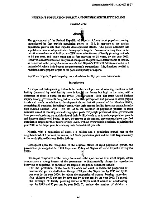 The government of the Federal Republic of'Nigeria, Africa's most populous country, promulgated its first explicit population policy in 1988, in response to the soaring population growth rate that impedes developmental efforts. The policy document has stipulated a number of quantitative demographic targets. Paramount among these is the intention to reduce total fertility rate (TFR) to 4, raise the use of family planning methods to 80 per cent, and raise mean age at first marriage to 18 years, by the year 2000. However, a macrosimulation analysis of changes in the proximate determinants of fertility as enshrined in the policy document reveals that Nigeria's TFR will fall from about 6 to 2 instead of 4, which is far beyond the government's expectations. It is, therefore, needful to revisit the demographic targets of the population policy of Nigeria.