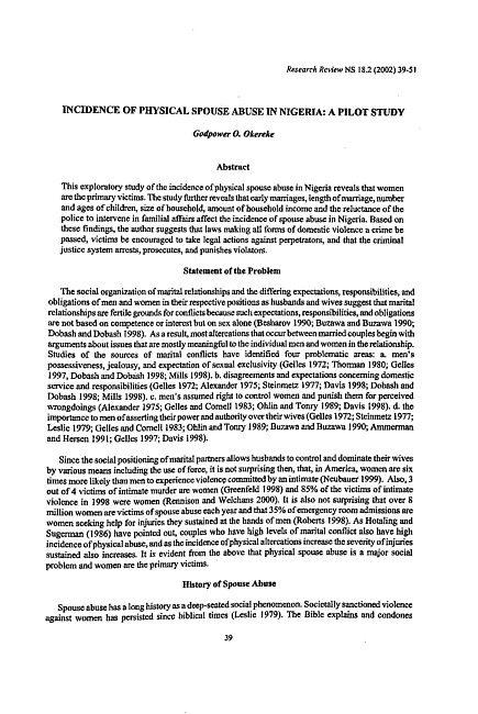 Incidence of physical spouse abuse in Nigeria : a pilot study