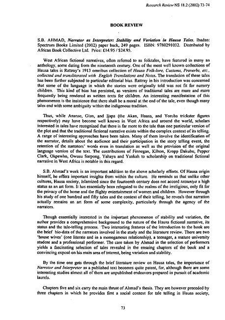 Review of: S.B. Ahmad. Narrator as Interpreter. Ibadan: Spectrum Books, 2002