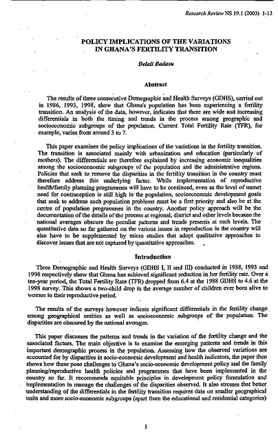 The results of three consecutive Demographic and Health Surveys (GDHS), carried out in 1986, 1993, 1998, show that Ghana's population has been experiencing a fertility transition. An analysis of the data, however, indicates that there are wide and increasing differentials in both the timing and trends in the process among geographic and socioeconomic subgroups of the population. Current Total Fertility Rate (TFR), for example, varies from around 3 to 7. This paper examines the policy implications of the variations in the fertility transition. The transition is associated mainly with urbanization and education (particularly of mothers). The differentials are therefore explained by increasing economic inequalities among the socioeconomic subgroups of the population and the administrative regions. Policies that seek to remove the disparities in the fertility transition in the country must therefore address this underlying factor. While implementation of reproductive health/family planning programmes will have to be continued, even as the level of unmet need for contraception is still high in the population, socioeconomic development goals that seek to address such population problems must be a first priority and also be at the centre of population programmes in the country. Another policy approach will be the documentation of the details of the process at regional, district and other levels because the national averages obscure the peculiar patterns and trends presents at such levels. The quantitative data so far gathered on the various issues in reproduction in the country will also have to be supplemented by micro studies that adopt qualitative approaches to discover issues that are not captured by quantitative approaches.