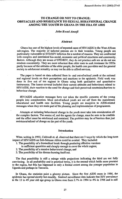 To change or not to change : obstacles and resistance to sexual behavioural change among the youth in Ghana in the era of AIDS