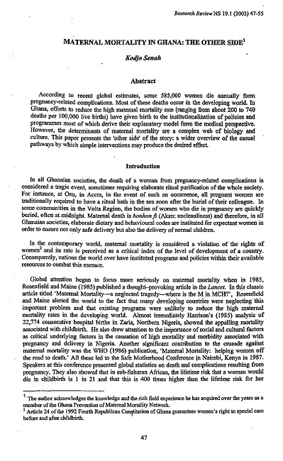 According to recent global estimates, some 585,000 women die annually form pregnancy-related complications. Most of these deaths occur in the developing world. In Ghana, efforts to reduce the high maternal mortality rate (ranging from about 200 to 740 deaths per 100,000 live births) have given birth to the institutionalization of policies and programmes most of which derive their explanatory model form the medical perspective. However, the determinants of maternal mortality are a complex web of biology and culture. This paper presents the 'other side' of the story: a wider overview of the casual pathways by which simple interventions may produce the desired effect.