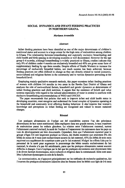 Infant feeding practices have been identified as one of the major determinants of children's nutritional status and account to a large extent for the high rates of malnutrition among children in Ghana. The relationship between breastfeeding and especially exclusive breastfeeding and child health and birth spacing in developing countries is well documented. However for the age group 0 -6 months, although breastfeeding i s widely practiced in Ghana, studies indicate that only 8% of children under 4 months are exclusively breastfed and 45% are given some form of supplementary feeding by age three months. Despite efforts of Health Workers to increase the percentage of exclusively breastfed babies, not much success has been achieved, because feeding practices are often difficult to change as they are directly related to varied economic, socio-cultural and religious factors in the community and to various dynamics prevailing at the household level. Employing mainly qualitative research methods, this paper examines infant feeding practices of women with children 0-6 months in two areas in the Bawku East District of Ghana and analyses the role of socio-cultural factors, household and gender dynamics as determinants of infant feeding practices and child nutrition. It argues that the existence of beliefs and value systems especially with regard to the cultural administration of water is central to conflicts with exclusive breastfeeding recommendations of WHO and UNICEF. The paper recommends that policies that seek to improve infant and child health status in developing countries, must recognise and understand the broad complex of dynamics operating at the household and community level affecting feeding behaviour. It also requires that women's knowledge and perceptions on infant feeding are recognised and valued to ensure sustained changes.
