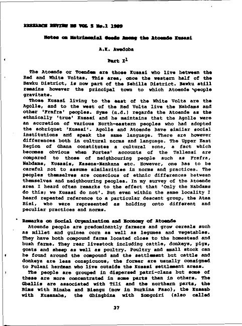 Notes on matrimonial goods among the Atoende Kusasi. Part I
