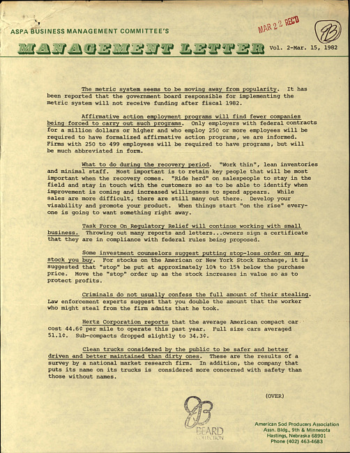 ASPA Business Management Committee's management letter. Vol. 2 (1982 March)