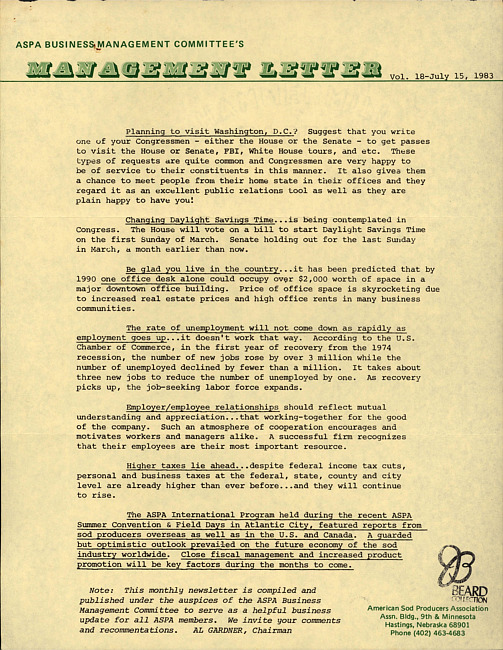 ASPA Business Management Committee's management letter. Vol. 18 (1983 July)