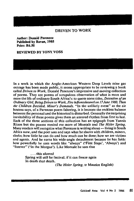 Review of: Donald Parenzee. Driven to work. Johannesburg: Ravan Press, 1985