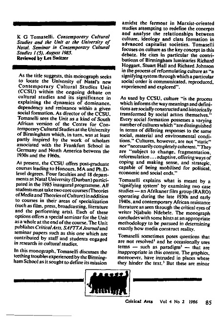 Reviews of: Keyan Gray Tomaselli. Contemporary cultural studies and the Unit of the University of Natal. Durban: Contemporary Cultural Studies Unit, University of Natal, 1985; James Watson. What is communication studies? London: Edward Arnold, 1985; Landeg White and Tim Couzens (eds.). Literature and society in South Africa. Pinelands, Cape: Maskew Miller Longman, 1984; John J. Pungente. Getting started on media education. London: Centre for the Study of Communication and Culture, 1985; Dennis Walder. Athol Fugard. London: Macmillan, 1984